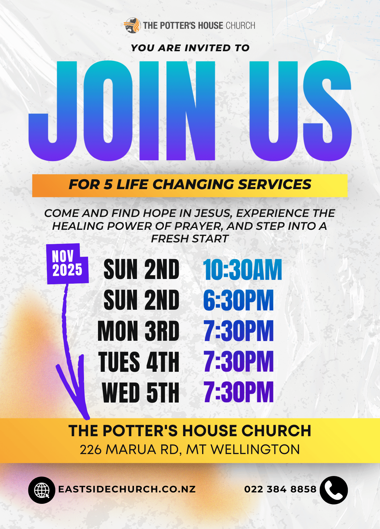 📍 The Potter’s House Church – 226 Marua Rd, Mt Wellington